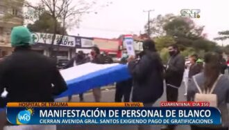 Este jueves, las movilizaciones del personal de blanco continuaron. Esta vez enfermeros y funcionarios de limpieza del Hospital del Trauma cerraron la avenida General Santos para exigir al gobierno el pago de gratificación por riesgo, ante la pandemia del Covid-19.