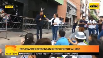 La Federación Nacional de Estudiantes Secundarios (Fenaes) realizó un pequeño sketch frente al Ministerio de Educación y Ciencias (MEC) reclamando la renuncia del jefe de cartera, Eduardo Petta. Los manifestantes rechazaron los materiales educativos con errores distribuidos por la institución.