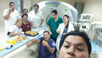 Una imagen publicada en Facebook muestra a unos funcionarios del IPS festejando la jubilación de una compañera en una sala de tomografía y sobre el costoso aparato.