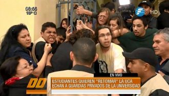 La sede del Rectorado de la Universidad Católica que se encuentra tomada por los estudiantes de la Facultad de Filosofía fue escenario de un forcejeo entre los universitarios y guardias privados, quienes trataron de ingresar al lugar a la fuerza.
