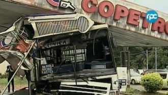 En la madrugada de hoy un bus de la línea 47 de la empresa Automotores Guaraní, produjo un aparatoso choque. Uno de los buses que disputaba una alocada carrera con otro de la misma empresa terminó incrustándose contra una estación de servicios.