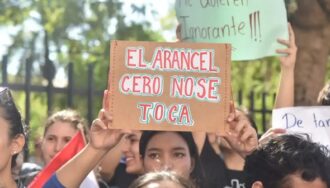 Estudiantes de la UNA se manifiestan en defensa del Arancel Cero y contra el proyecto Hambre Cero.