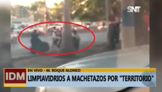 Limpiavidrios disputaron territorio a punta de machete. El hecho fue grabado por conductores en la zona de Mariano Roque Alonso, en inmediaciones de la expoferia de la Asociación Rural del Paraguay.