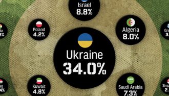 Análisis del gasto militar global muestra a Ucrania con 34% del PIB en defensa, seguida por Israel (8,8%) y Argelia (8%). Estados Unidos lidera en cifras absolutas.