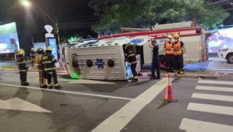 Un insólito percance vial tuvo lugar cuando una ambulancia del Hospital de Policía volcó al ser embestida por una camioneta del Ministerio de Salud.