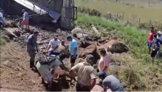 Tras el vuelco de un camión con ganado en Caapucú, personas faenaron animales heridos en plena ruta. Policía fue superada por la multitud.