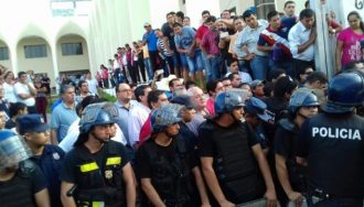 La policía Nacional llegó hasta el colegio Fernando de la Mora con la intención de ingresar a la institución, pero los estudiantes no permitieron que avancen generando empujones e insultos.