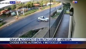 Una moto y un automóvil colisionaron de forma frontal sobre la ruta que une Luque y Areguá. El motociclista terminó sobre el pavimento, mientras que su acompañante quedó sobre el techo del vehículo, que no paró la marcha hasta que testigos del lugar lograron detenerlo.