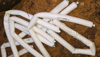 Supuesto explosivo tipo “banana en gel” encontrado en la ribera del río Paraná en Ciudad del Este. La zona fue acordonada y se realizan peritajes para confirmar la naturaleza del artefacto.