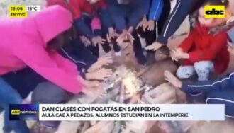 Niños que asisten a la escuela San Isidro Labrador de San Pedro de Ycuamandyyú, dan clases en la intemperie ya que no cuentan con un aula. Realizan fogatas y se cobijan en un pabellón que se cae a pedazos exponiéndose al peligro.
