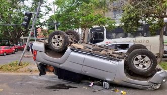 Choque y vuelco en Av. San Martín dejan importantes daños materiales, pero sin heridos graves. PMT y bomberos gestionan el despeje de la vía.