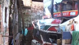 Un bus de la Línea 36 proveniente de Limpio perdió los frenos y, en un intento por evitar chocar contra un camión de gran porte, terminó impactando y derrumbando la muralla de una vivienda.