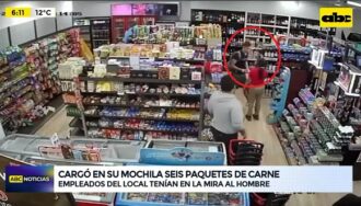 El circuito cerrado de un supermercado captó el momento en que una persona estaba cargando en su mochila al menos seis paquetes de carne envasada. El comercio afectado es de la cadena Biggie de Asunción.
