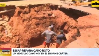 Técnicos de la ESSAP continúan con los trabajos de reparación de las cañerías que provocaron el gran cráter sobre la calle Fulgencio R. Moreno.