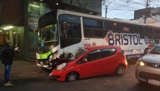 Un bus de la Línea 48 embistió contra un pequeño automóvil que llevaba en su interior a tres mujeres y un hombre. Ocurrió en el centro de la capital y debido a un semáforo descompuesto.