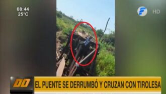 Pobladores nativos que quedaron aislados tras la caída de un puente de madera sobre el río Aquidabán, utilizan una tirolesa para cruzar, arriesgando sus vidas.