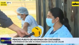 Un contenedor, sin aire acondicionado ni agua en plena ola de calor, es el puesto de hisopado de la Costanera de Asunción, donde profesionales de la salud prestan servicio y pacientes acuden para hacerse la prueba de diagnóstico del Covid-19.