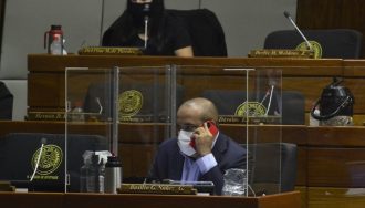 El diputado Basilio “Bachi” Nuñez se mostró este martes dentro de un particular cubículo para evitar el contacto con los demás en la Cámara Baja.