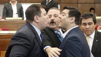 La sesión extraordinaria de la Cámara de Senadores, que buscaba fijar el reemplazante del legislador Paraguayo Cubas, fue suspendida momentáneamente porque los parlamentarios liberales Dionisio Amarilla y Salyn Buzarquis casi llegaron a la agresión física.