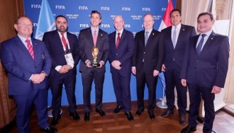 Autoridades paraguayas presentan carta de compromiso a Gianni Infantino en París, reafirmando su participación en el Mundial 2030 como sede de celebración.