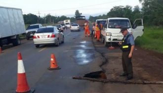 El hundimiento de la capa asfáltica a raíz de las lluvias en el kilómetro 107 de la ruta 2 “Mariscal Estigarribia” provoca que el tránsito en la zona este cortado. Ya iniciaron los trabajos de reparación.
