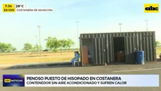Un contenedor, sin aire acondicionado ni agua en plena ola de calor, es el puesto de hisopado de la Costanera de Asunción, donde profesionales de la salud prestan servicio y pacientes acuden para hacerse la prueba de diagnóstico del Covid-19.