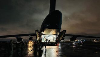 El carguero C-5 Super Galaxy trajo desde EE.UU. un carro hidrante y equipos donados a las Fuerzas Militares para fortalecer emergencias.