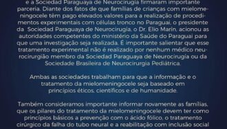 La Sociedad Brasilera de Neurocirugía Pediátrica ha emitido dos comunicados de alerta sobre un tratamiento experimental con células madre que se ofrece en Ciudad del Este, Paraguay.