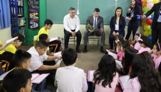 El presidente de la República, Santiago Peña compartió un emotivo momento con los niños de la escuela República Federal de Alemania donde realizó una lectura de cuentos infantiles a los alumnos.
