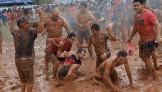El embajador británico, Ramín Navai, participó activamente en la Fiesta del Tuyú en Nueva Londres, sumergiéndose en el barro tradicional.