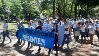 Funcionarios, docentes y alumnos de la Universidad Nacional de Asunción realizaron una manifestación en Asunción exigiendo la aprobación de un presupuesto justo en el Congreso.