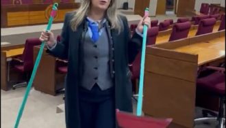 La exsenadora Kattya González llegó al Congreso con escoba y palita para denunciar corrupción en las binacionales y criticar al cartismo.