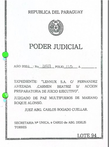 Imagen anterior Imagen siguiente juiciopagareslennux Expediente. La demanda fue presentada en diciembre del 2024 en el Juzgado de Paz de Mariano Roque Alonso. Foto: Gentileza. Recibí las noticias que otros medios no publican. Unite al canal de RDN en WhatsApp 📲 10:27 ✓✓ 1